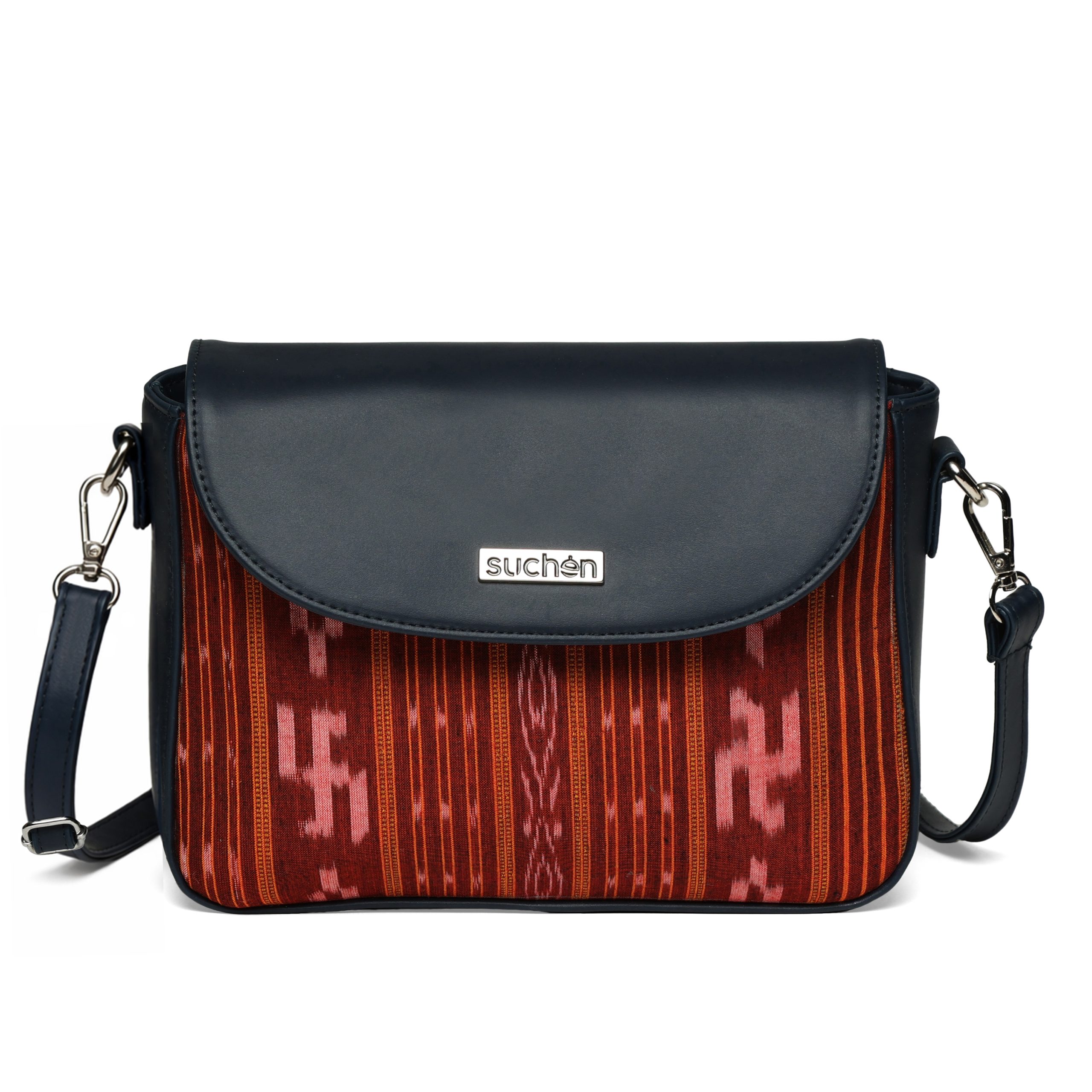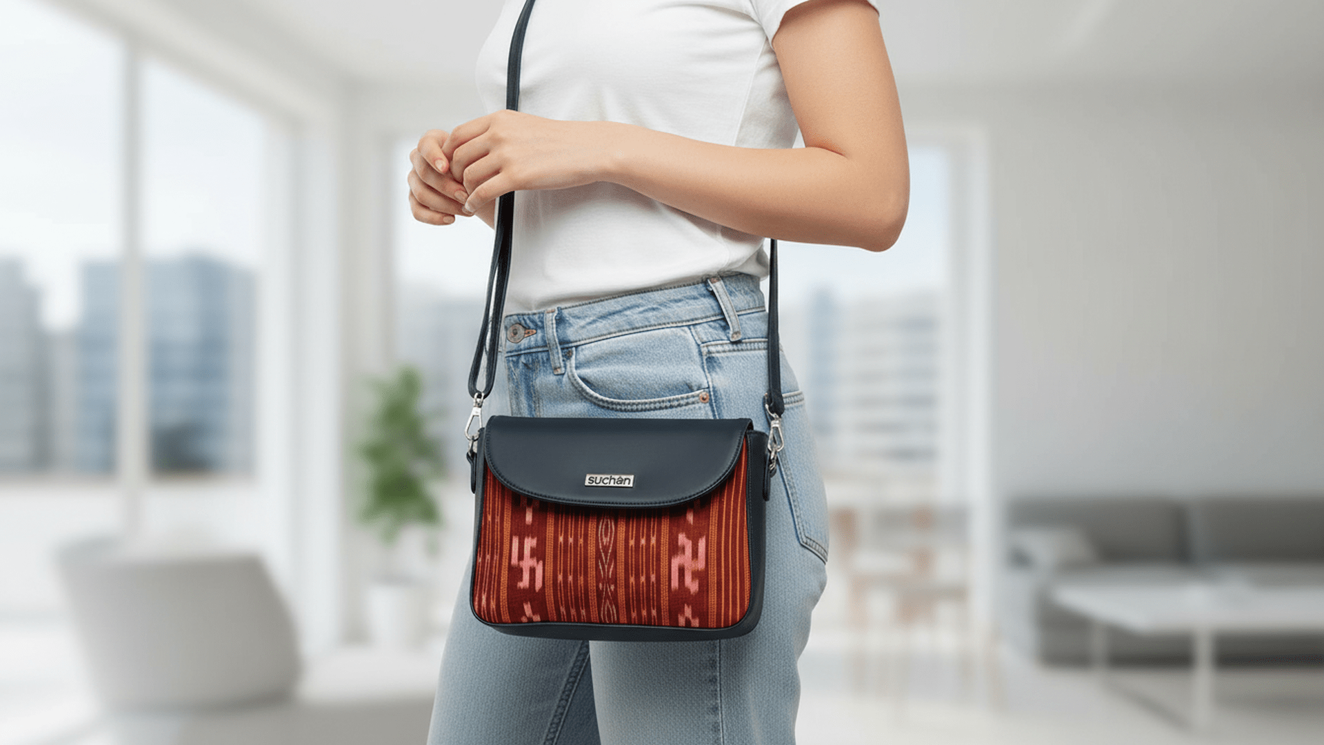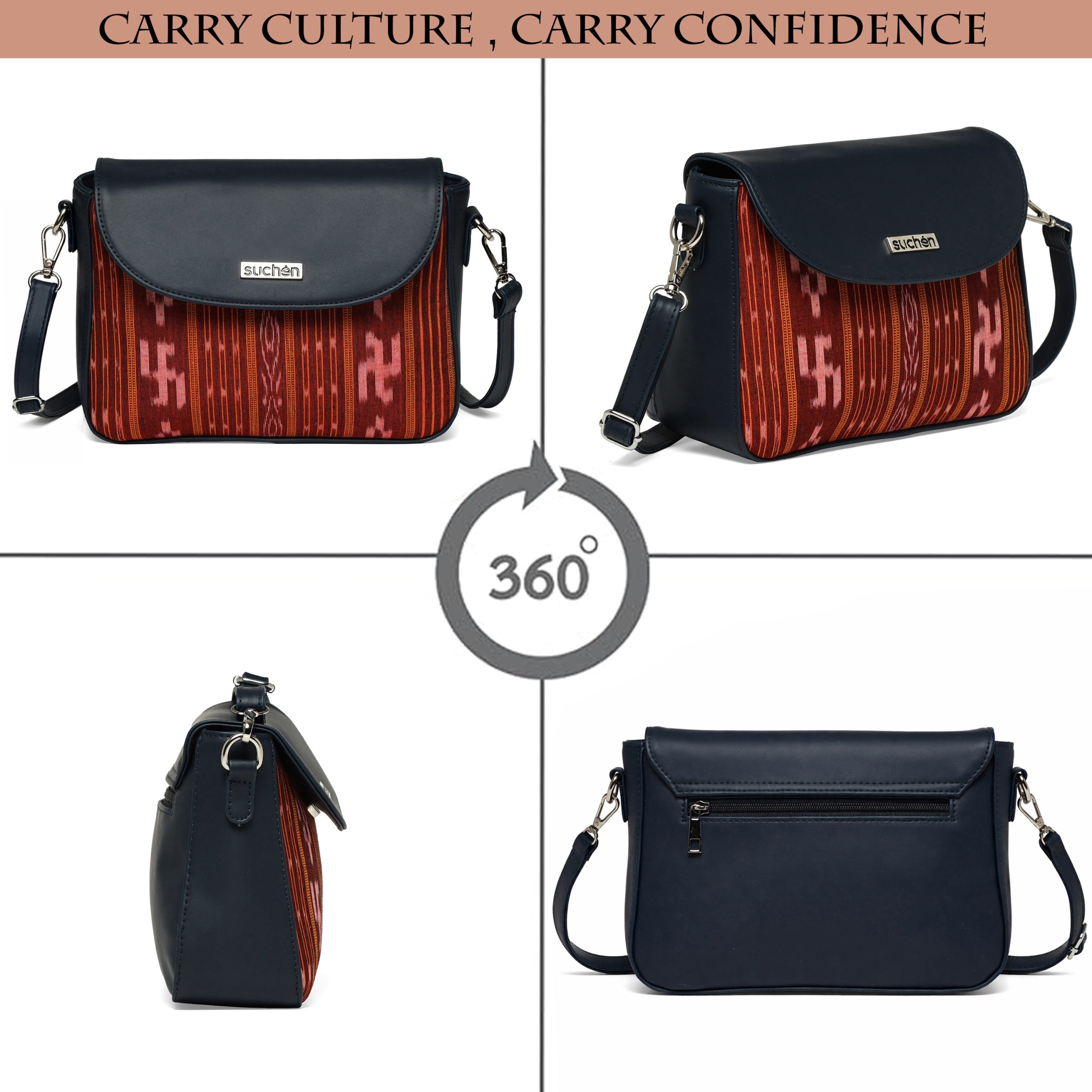About this item SUCHEN sling bag for women blends luxury vegan leather with heritage Sambalpuri-style Ikat fabric, offering an elegant crossbody perfect for both western and ethnic outfits. A part of every SUCHEN purchase supports girls’ education and empowers local craftsmen Features a roomy compartment with dedicated space for mobile, wallet, keys, cosmetics, water bottle, and more, along with a zipper pocket and slip section for better organization. Lightweight and durable, this sling bag includes an adjustable shoulder strap for comfort, making it suitable for travel, office, shopping, or evening outings. A multi-purpose design that doubles as a stylish daily sling, an office bag, or an evening crossbody — crafted for modern women who value style and functionality. Proudly made in India, these handcrafted purses make a perfect gift for birthdays, anniversaries, or festive occasions.