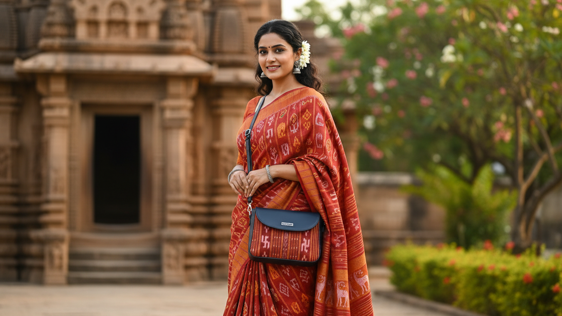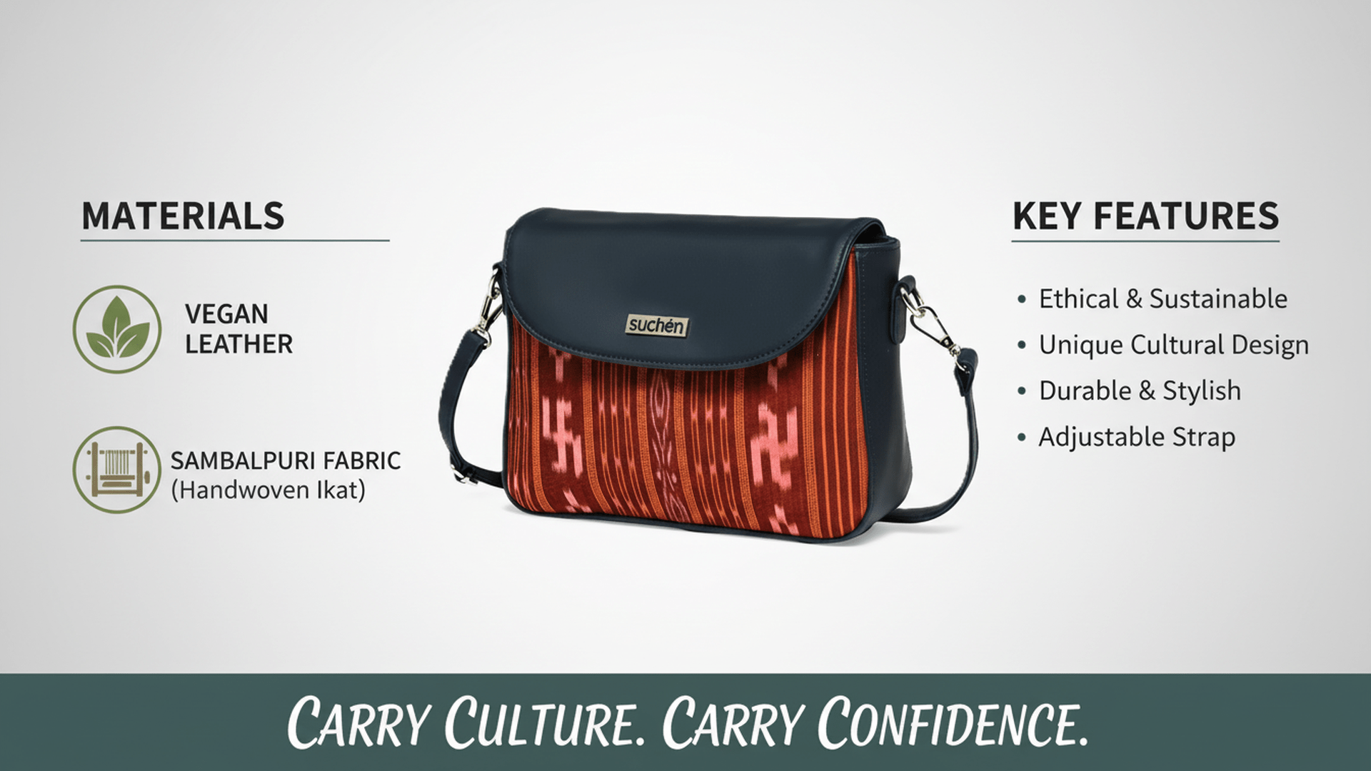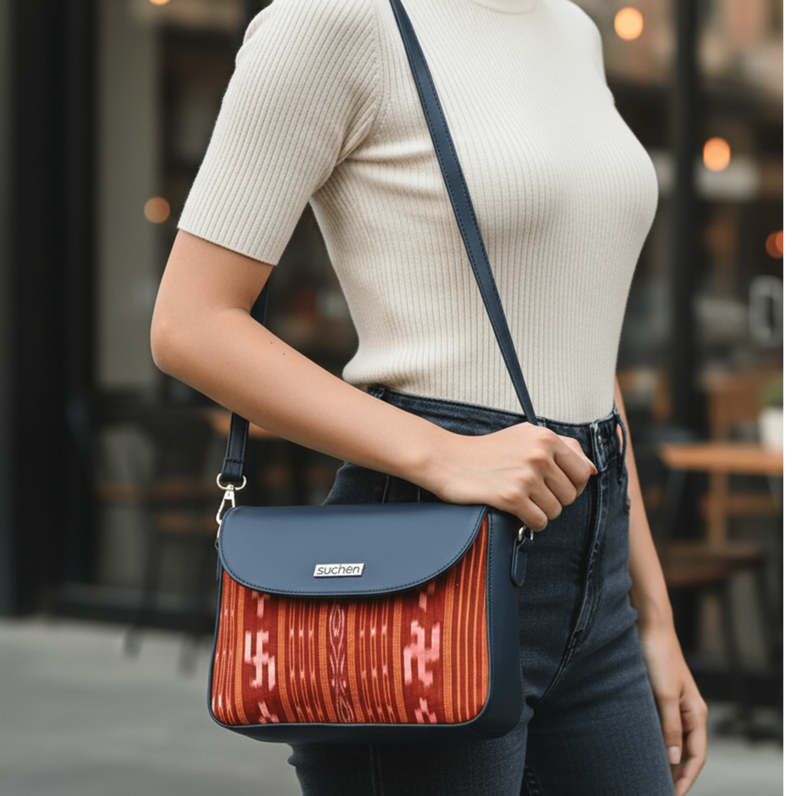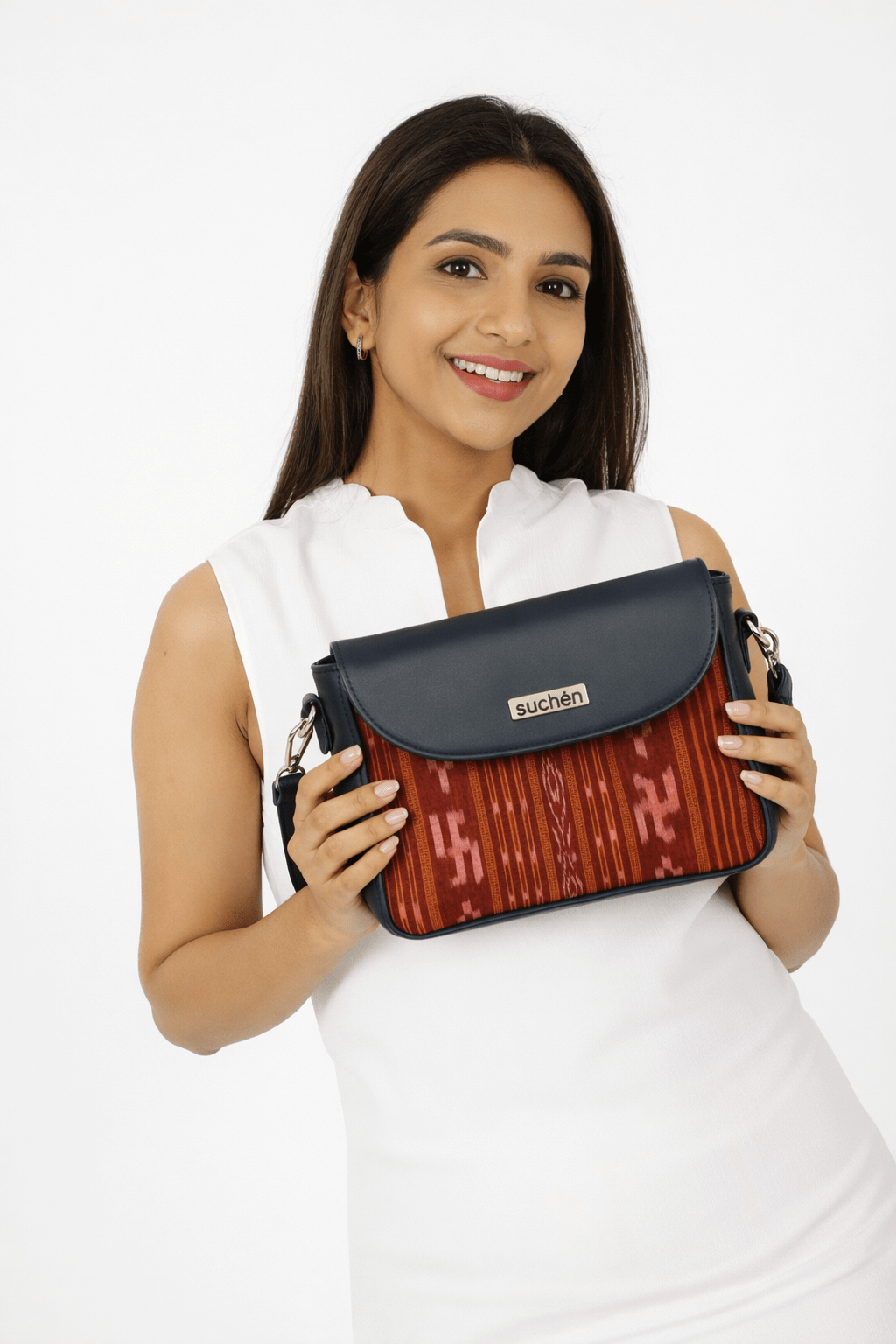 About this item SUCHEN sling bag for women blends luxury vegan leather with heritage Sambalpuri-style Ikat fabric, offering an elegant crossbody perfect for both western and ethnic outfits. A part of every SUCHEN purchase supports girls’ education and empowers local craftsmen Features a roomy compartment with dedicated space for mobile, wallet, keys, cosmetics, water bottle, and more, along with a zipper pocket and slip section for better organization. Lightweight and durable, this sling bag includes an adjustable shoulder strap for comfort, making it suitable for travel, office, shopping, or evening outings. A multi-purpose design that doubles as a stylish daily sling, an office bag, or an evening crossbody — crafted for modern women who value style and functionality. Proudly made in India, these handcrafted purses make a perfect gift for birthdays, anniversaries, or festive occasions.