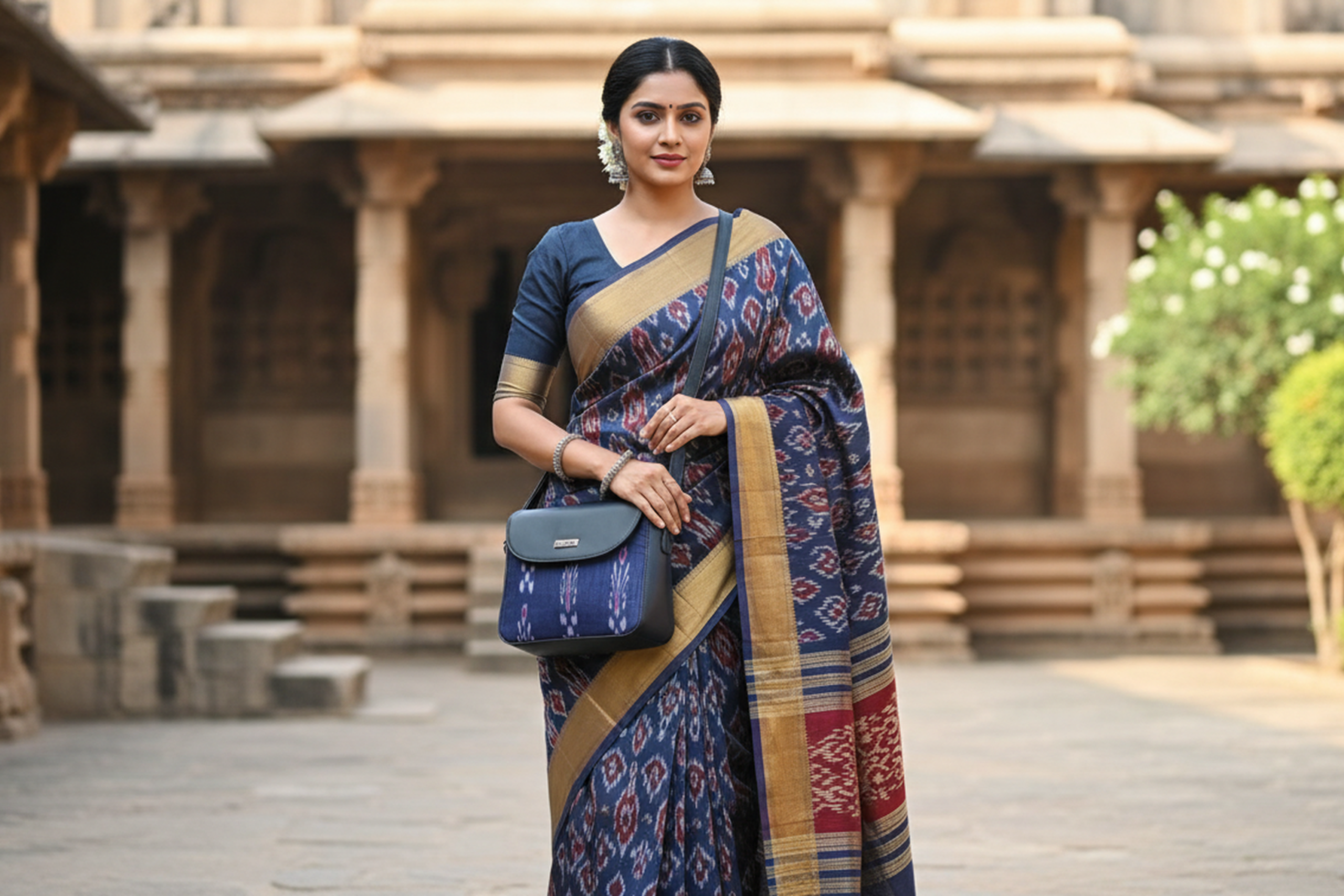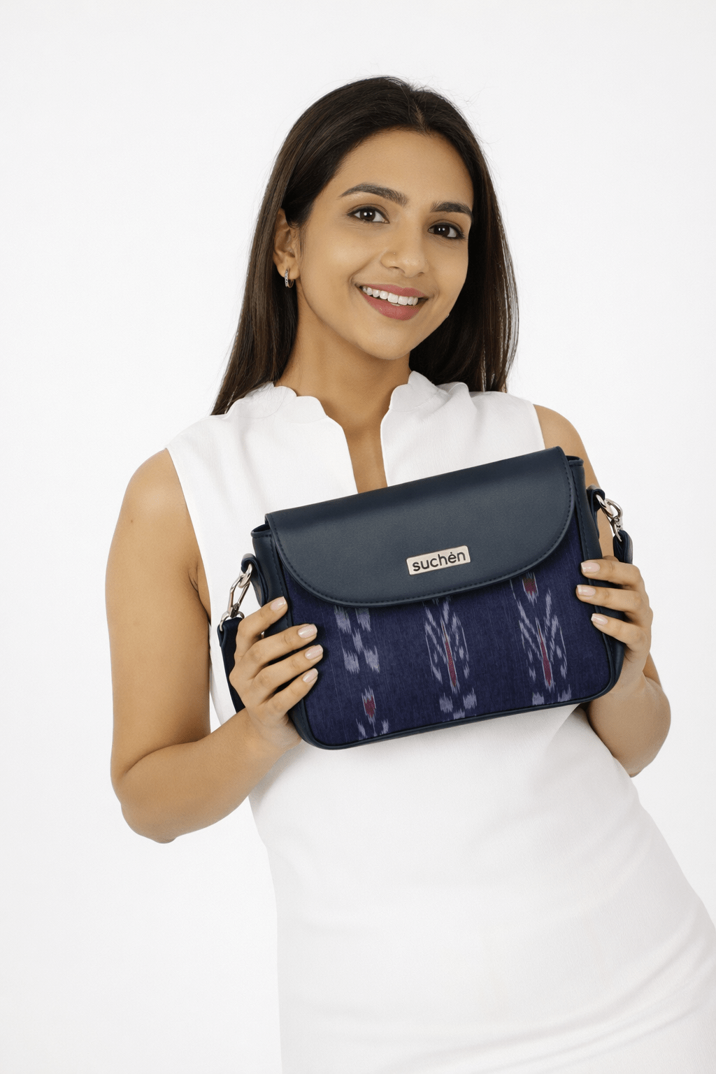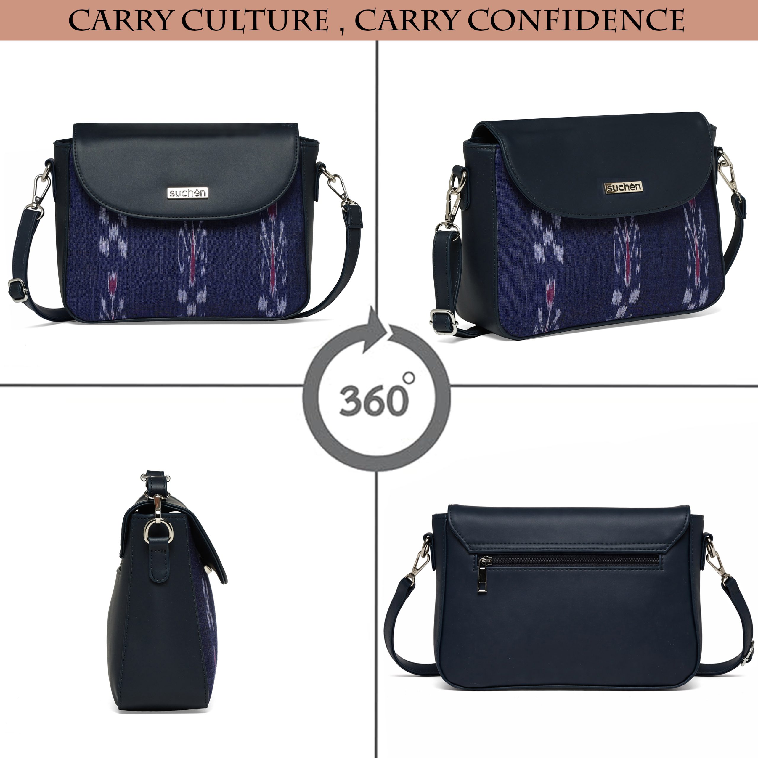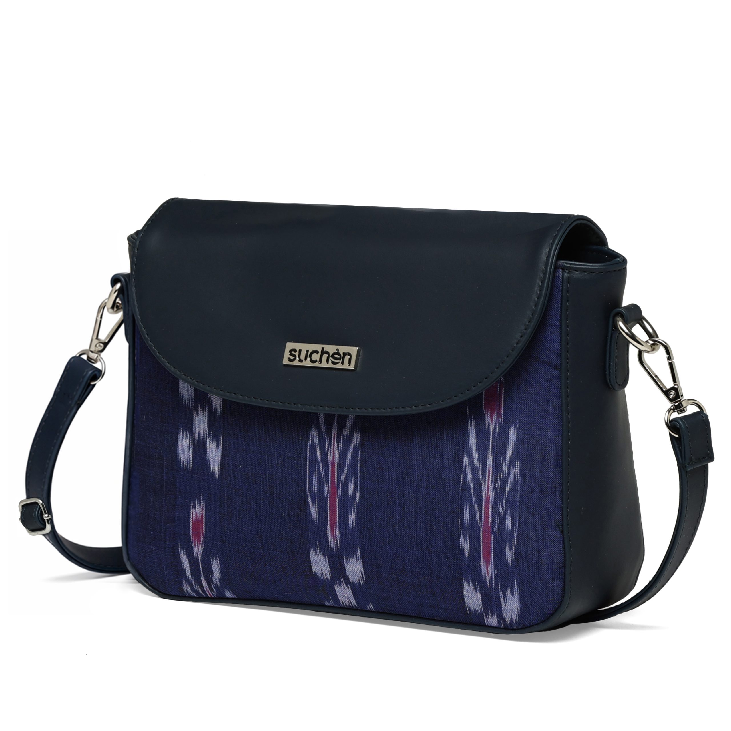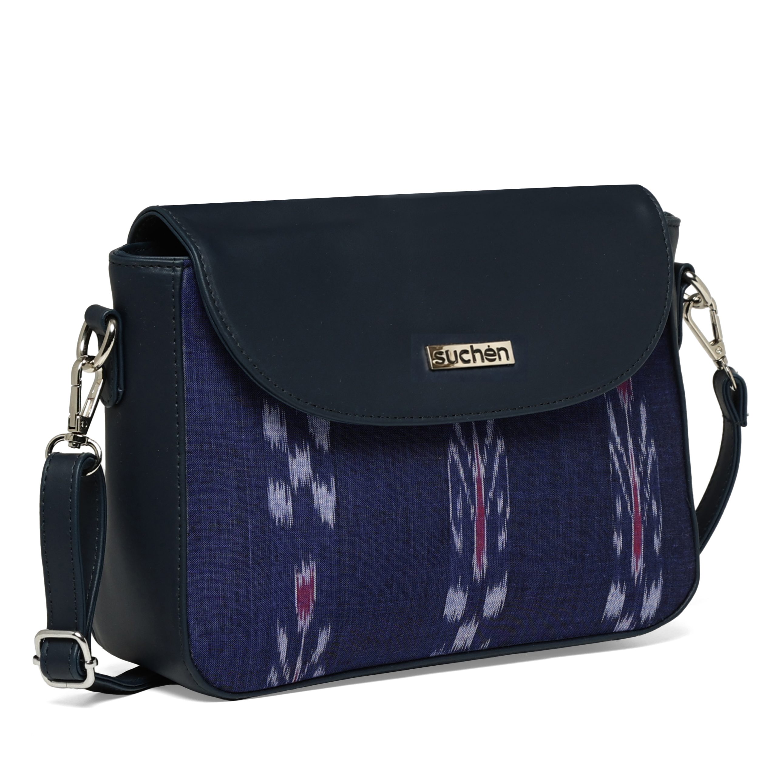 About this item SUCHEN sling bag for women blends luxury vegan leather with heritage Sambalpuri-style Ikat fabric, offering an elegant crossbody perfect for both western and ethnic outfits. A part of every SUCHEN purchase supports girls’ education and empowers local craftsmen Features a roomy compartment with dedicated space for mobile, wallet, keys, cosmetics, water bottle, and more, along with a zipper pocket and slip section for better organization. Lightweight and durable, this sling bag includes an adjustable shoulder strap for comfort, making it suitable for travel, office, shopping, or evening outings. A multi-purpose design that doubles as a stylish daily sling, an office bag, or an evening crossbody — crafted for modern women who value style and functionality. Proudly made in India, these handcrafted purses make a perfect gift for birthdays, anniversaries, or festive occasions.